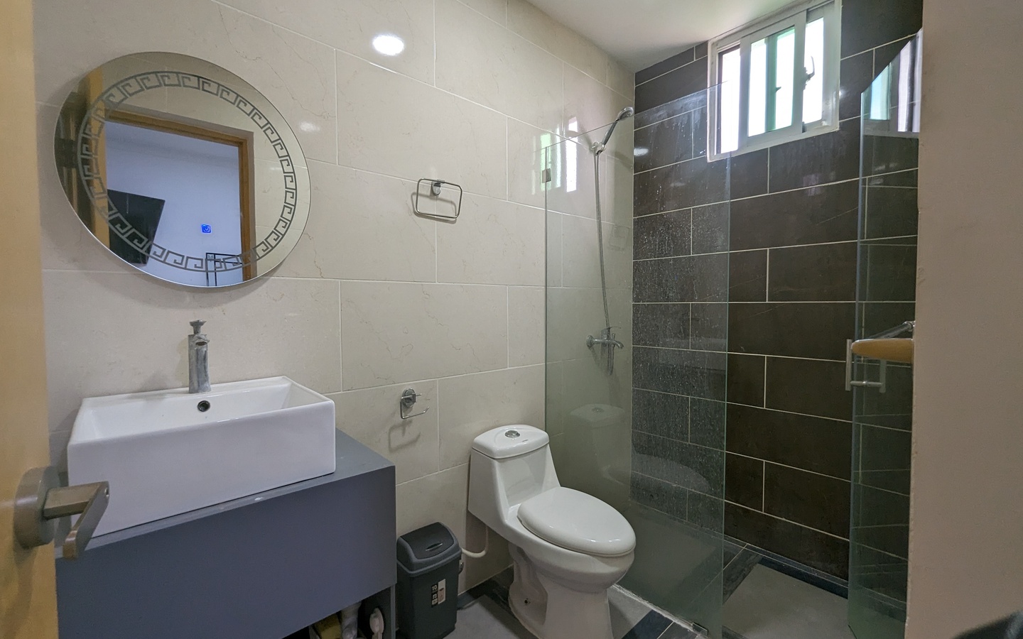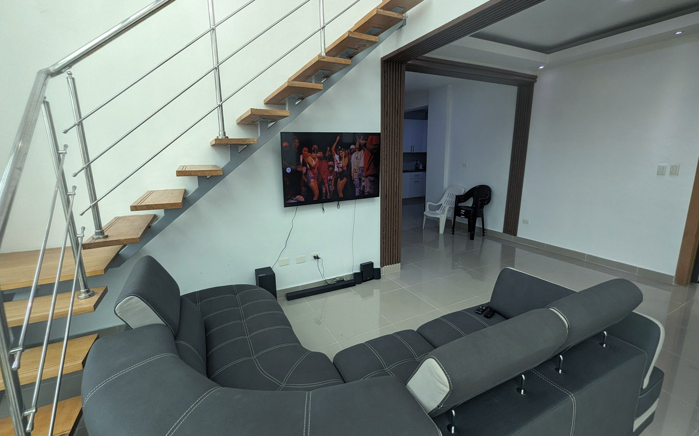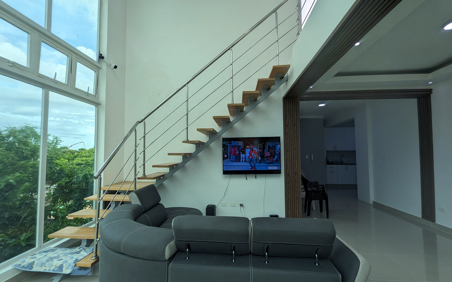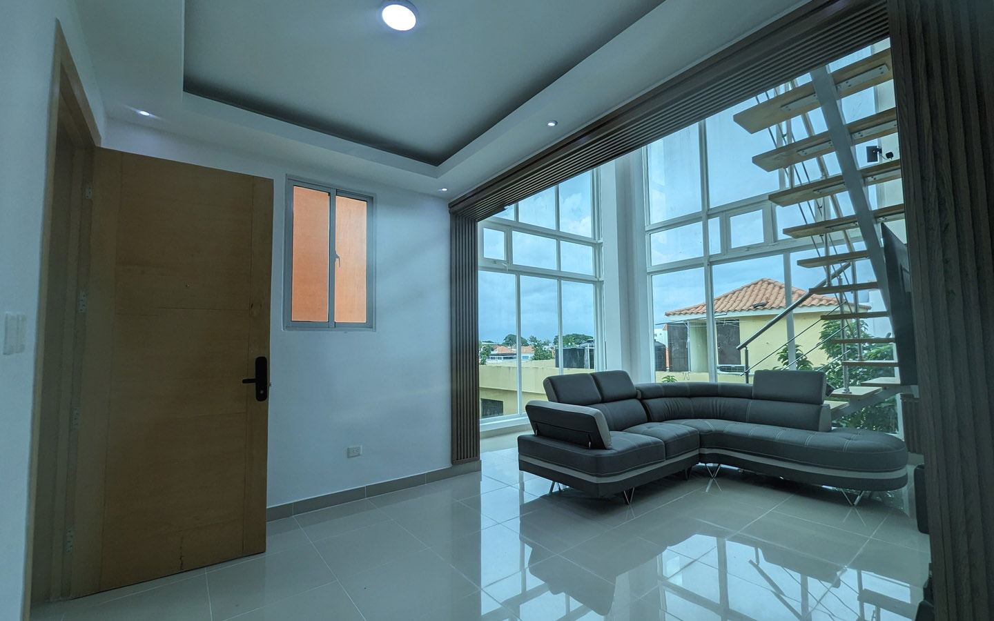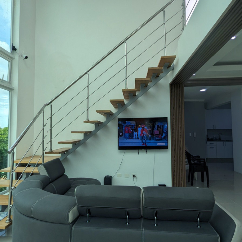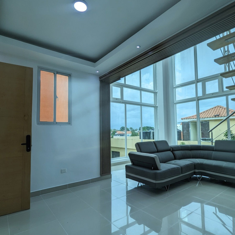 Con una sala que impresiona por su altura y ventanales de cristal de suelo a techo. La cocina y las puertas están protegidas con acabado hidrófugo, y la escalera que conduce a la terraza está diseñada con madera y hierro inoxidable. Además, el proyecto cuenta con un pozo tubular que garantiza un suministro constante de agua, evitando problemas en ese sentido.
